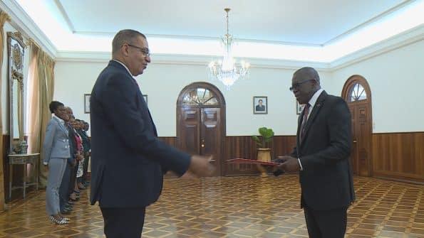 Entrega das Cartas Credenciais de S/Excia. Embaixador Fidelino Peliganga à S/Excia Presidente da República Democrática de São Tomé e Príncipe, Carlos Manuel Vila Nova